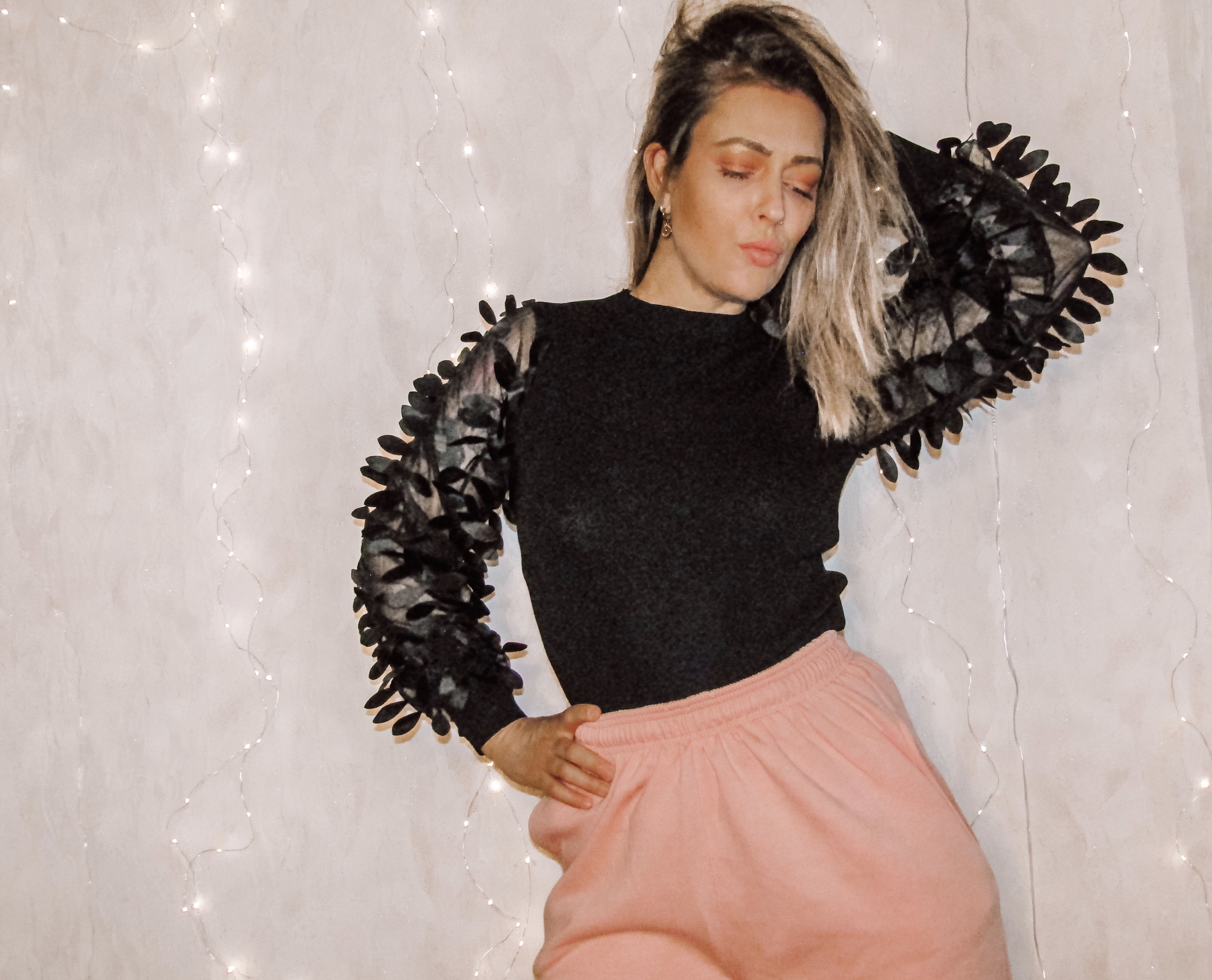 I was missing a black one, so here I am, wearing this beautiful ribbed top called Lucy, decorated with black leaves on the sleeves made of mesh.